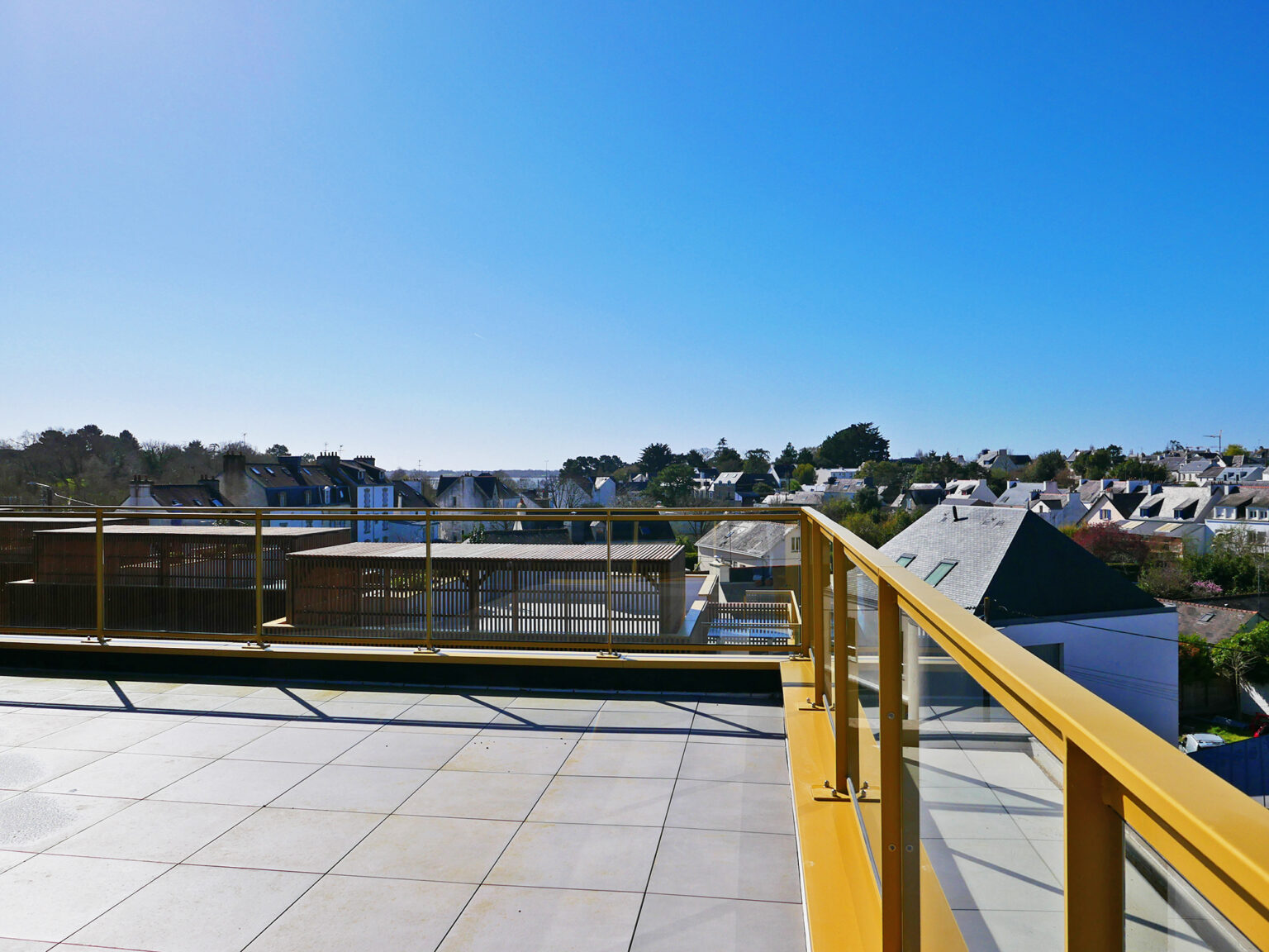 La pièce de vie, baignée de lumière, constitue le cœur vibrant du lieu. Elle s’ouvre sur une terrasse de 42 m2, véritable belvédère urbain. Le regard s’y glisse vers le Golfe du Morbihan et la promenade de la Rabine, offrant un décor vivant, changeant au rythme des marées et des saisons.