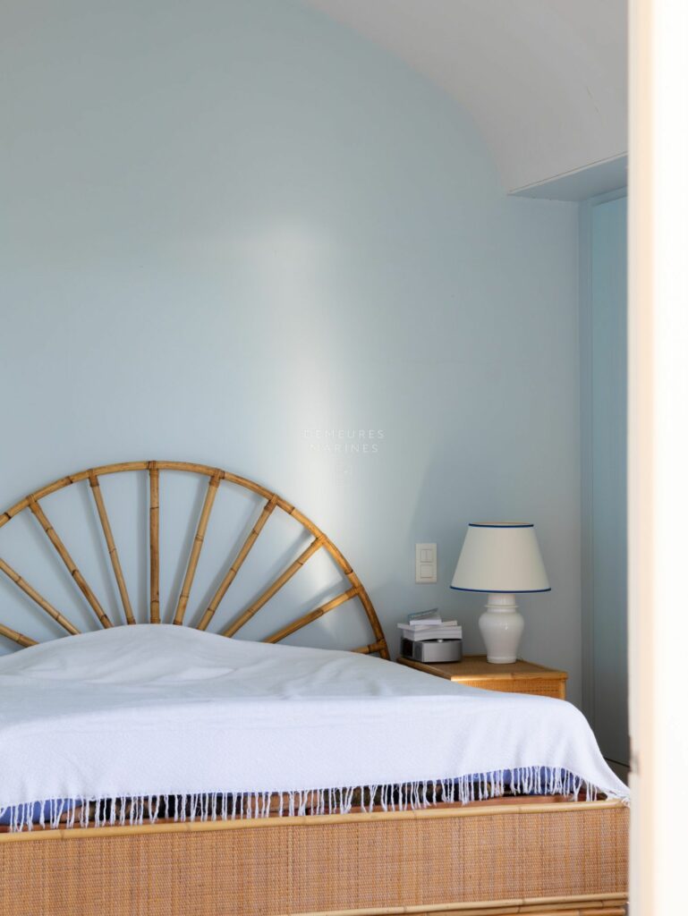 À l’étage, une mezzanine surplombe la pièce de vie, propice à la lecture ou au travail. Elle dessert deux chambres avec vue sur l’océan et une salle de bains. La suite parentale avec dressing et salle de bains privative dispose d’un balcon avec une vue sur la piscine.