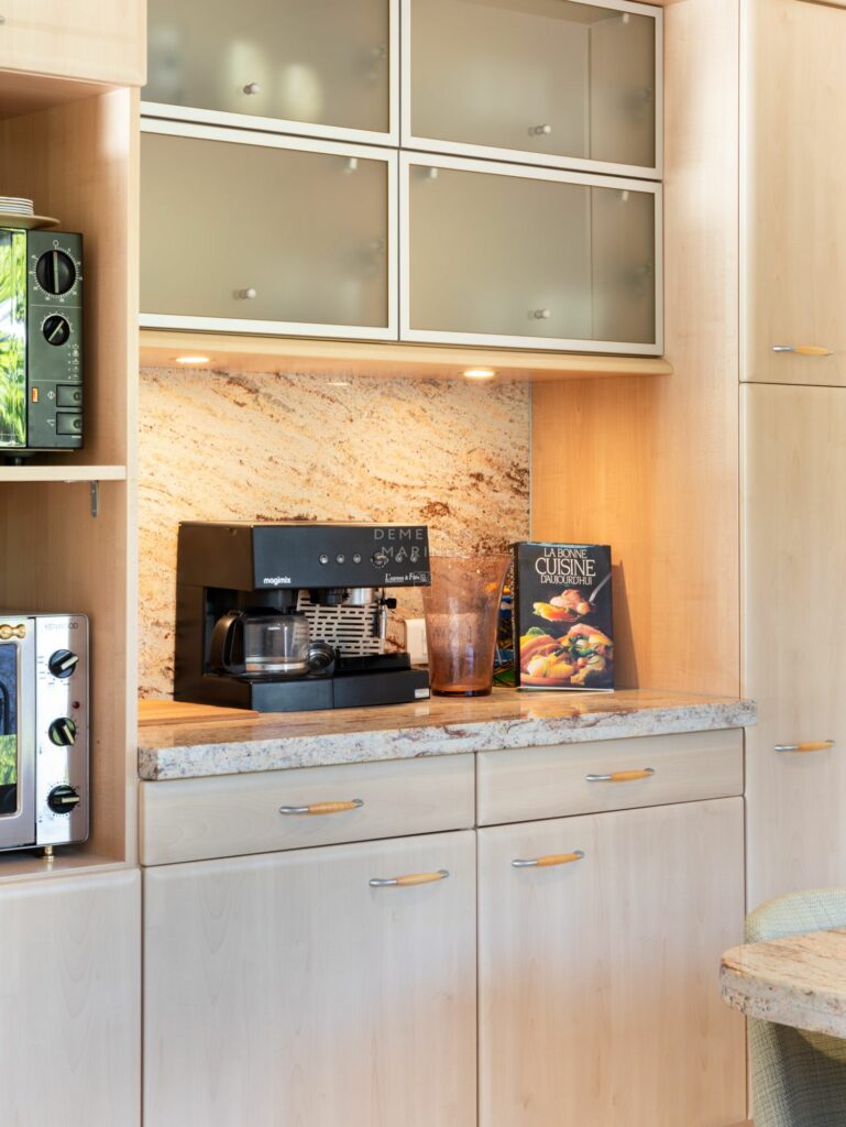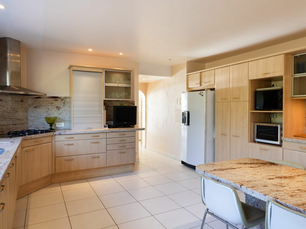 Au rez-de-chaussée, les espaces de réception, ouverts sur la terrasse avec la mer pour horizon, s’organisent autour d’un salon-séjour cathédrale animé par une cheminée en pierre. La cuisine aménagée et équipée, prolongée par une cuisine d’été et un patio, composent un ensemble convivial dédié aux moments partagés. Une arrière-cuisine et une lingerie complètent l’ensemble.