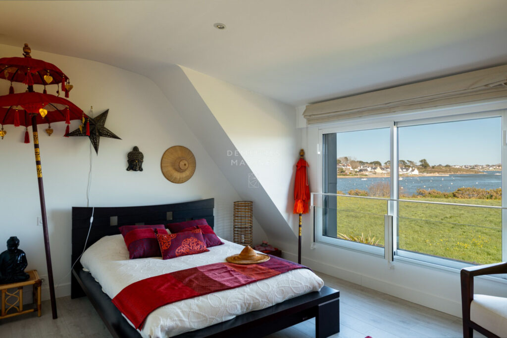 Demeures Marines vous présente « Joyce », une demeure familiale de 201 m2 située à Plouhinec, face à la ria d’Étel. Nichée au cœur d’un environnement sauvage et préservé, cette maison d’architecte signée Jean-François Riguidel révèle l’alliance subtile de la pierre et de l’ardoise avec l’élégance d’une rénovation d’exception menée entre 2017 et 2018.