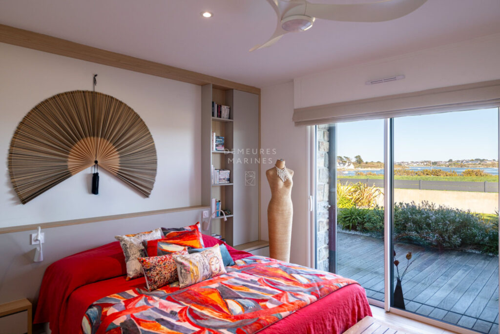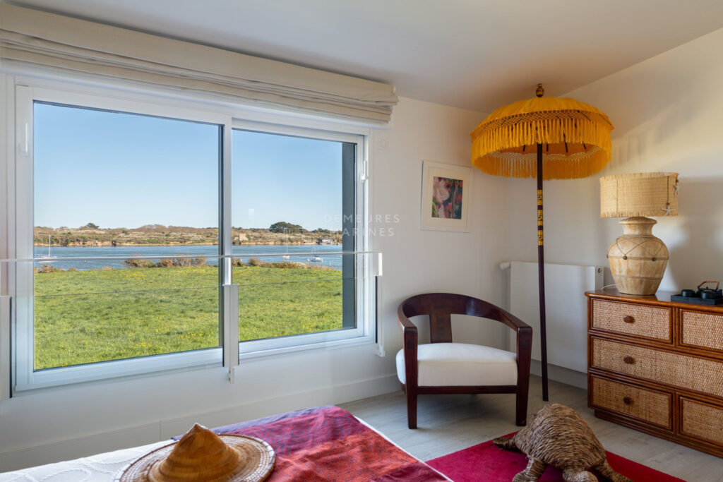À l’étage, l’espace nuit s’organise autour d’une mezzanine largement ouverte sur le paysage. Elle dessert une suite avec salle d’eau privative et balcon, ainsi que deux chambres avec placards et une salle d’eau indépendante. Ici, chaque ouverture révèle un point de vue privilégié sur la ria et le port d’Étel.