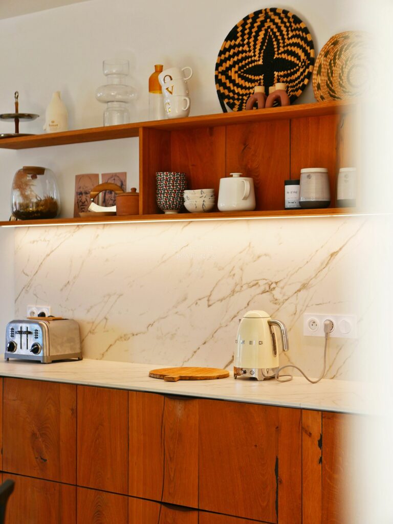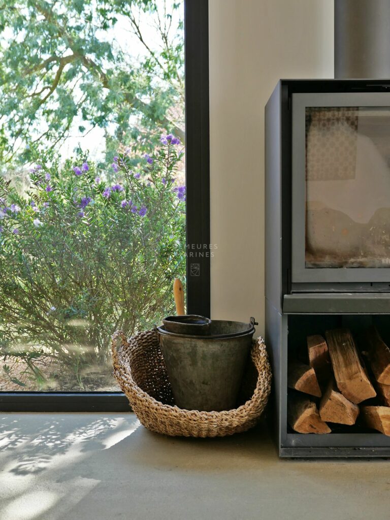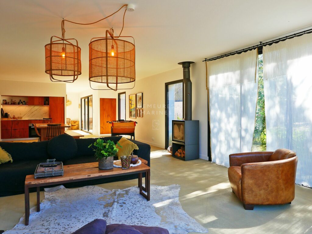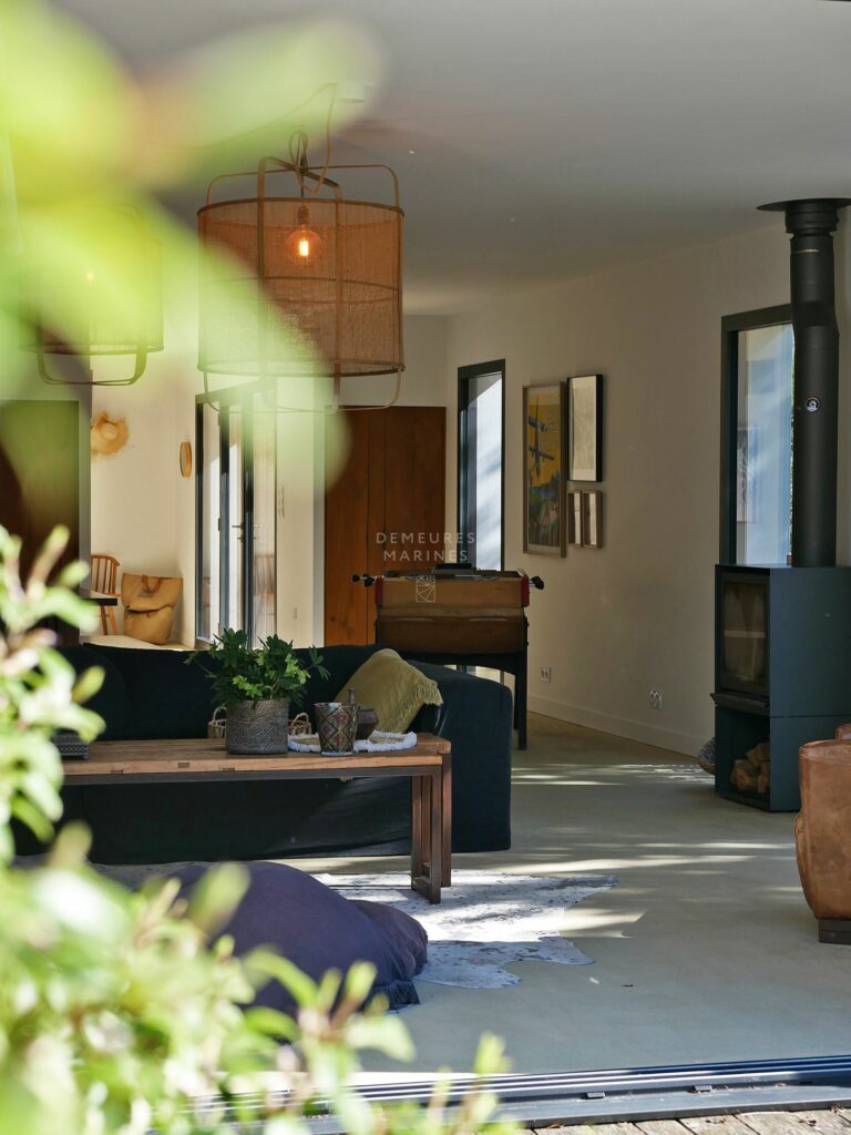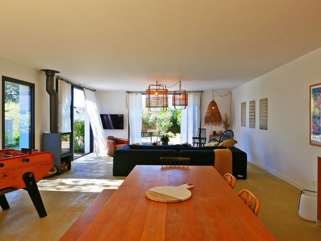 La pièce de vie, aux volumes généreux, s’organise autour d’une cuisine ouverte et d’un espace repas convivial. Son salon, animé par un poêle à bois, est la promesse de soirées douces et feutrées. L’ensemble s’ouvre sur le jardin, créant une continuité naturelle entre les espaces.