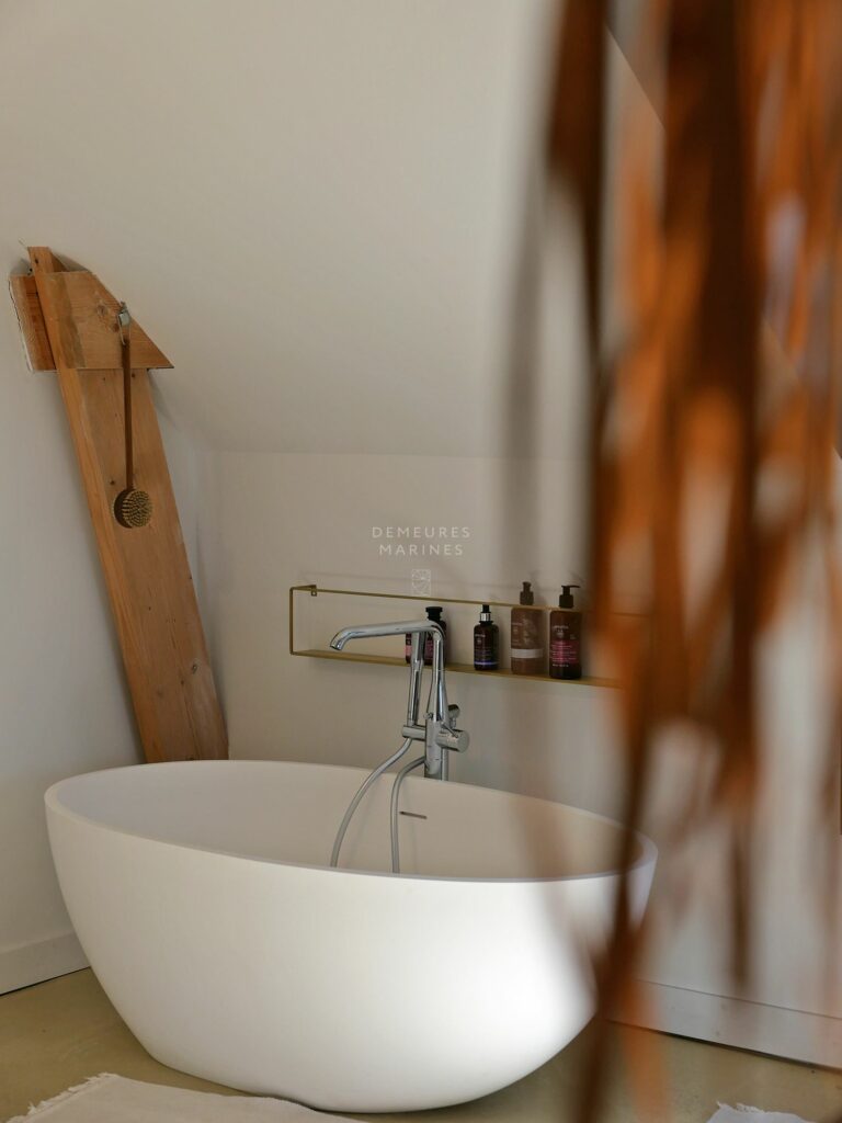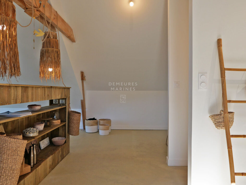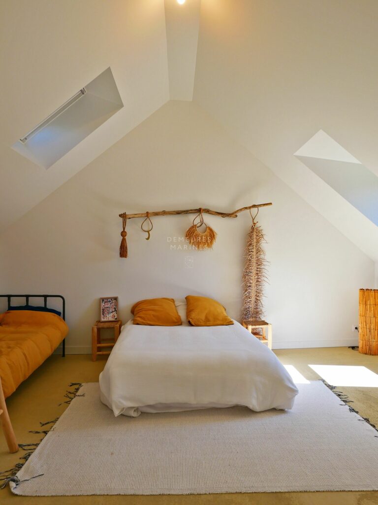 À l’étage, l’esprit « maison de vacances », prend sens. Une vaste chambre se prête, selon vos envies, à accueillir amis ou rires d’enfants dans un esprit dortoir. Une élégante suite au pignon vitré, véritable invitation à la détente, dispose de sa salle de bains privative. Une chambre et une salle d’eau indépendante complètent l’espace nuit.