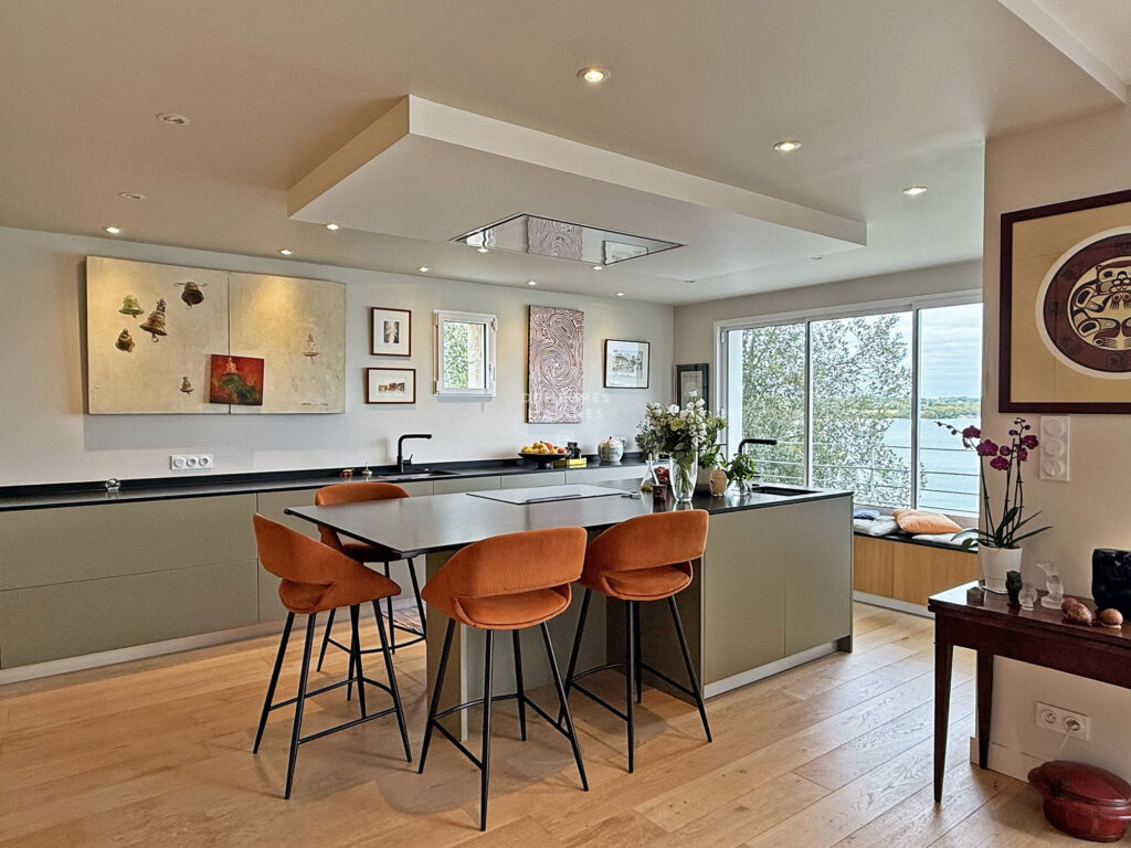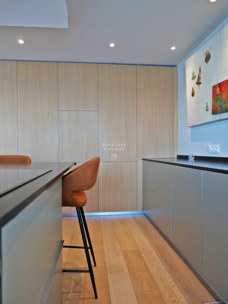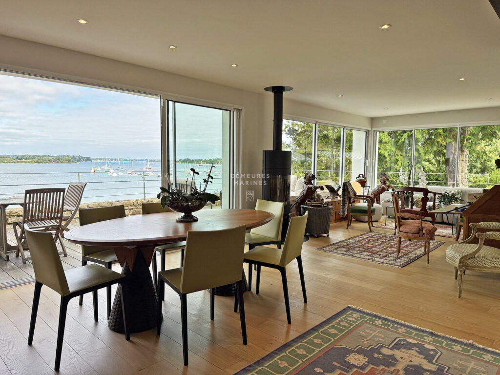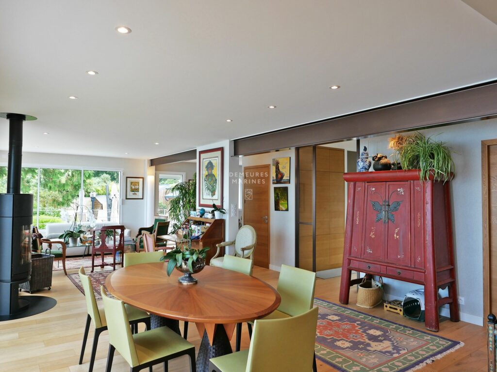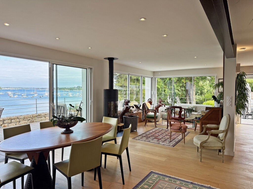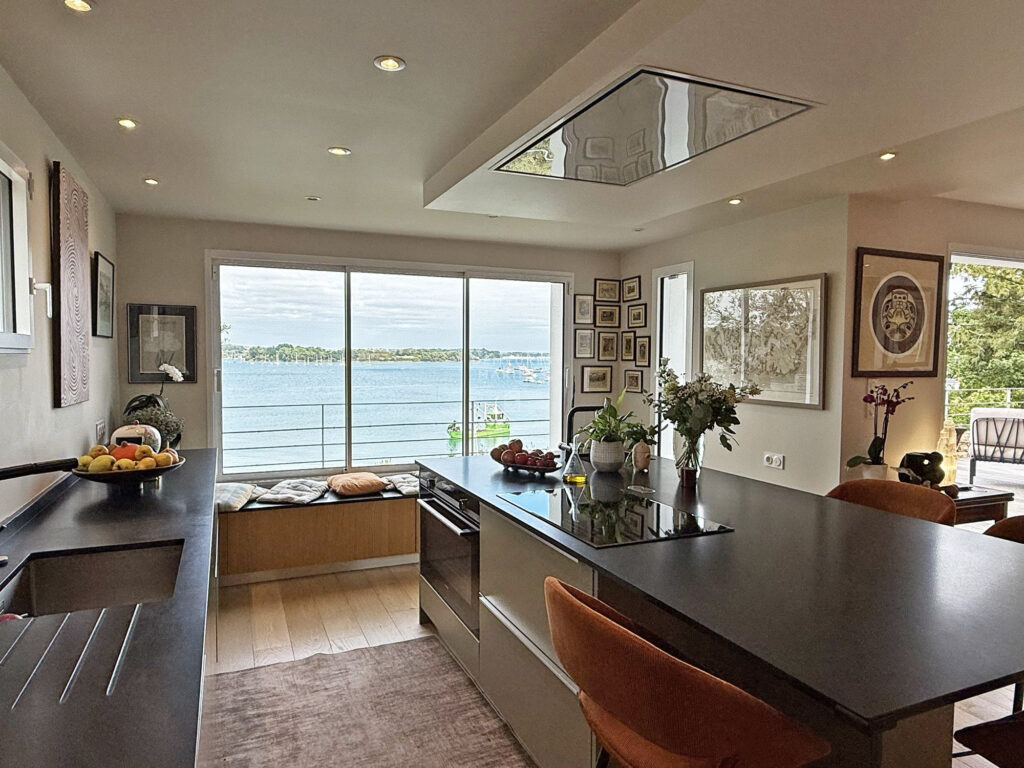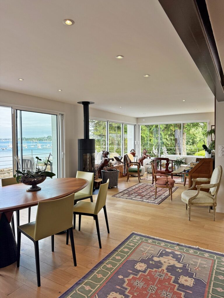 De nombreuses ouvertures inondent les espaces de lumière naturelle et offrent des vues imprenables sur le Golfe du Morbihan tout au long de la journée. L’intérieur, lumineux et fonctionnel, est en parfaite harmonie avec l’environnement extérieur.