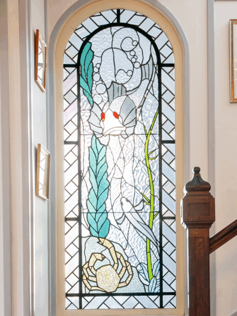 Les vitraux d’origine et la fresque en mosaïque rappellent, à chaque pas, l’élégance du savoir-faire artisanal d’autrefois et l’histoire bretonne. Sur le même niveau, la cuisine équipée et aménagée, agrémentée de son office, séduit par son caractère authentique et son atmosphère conviviale.