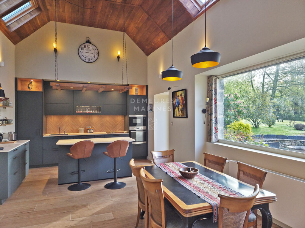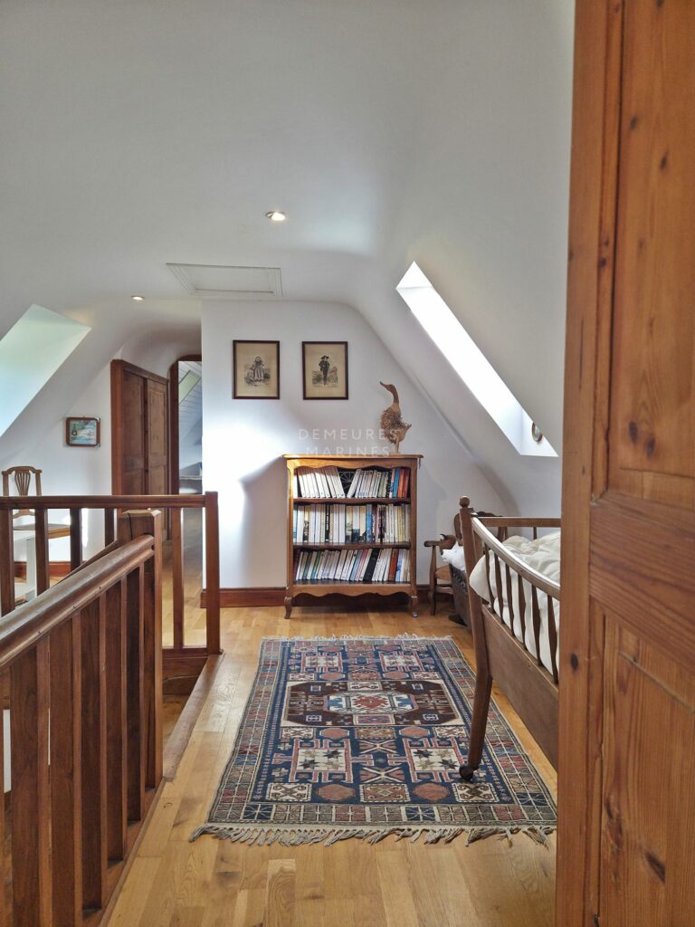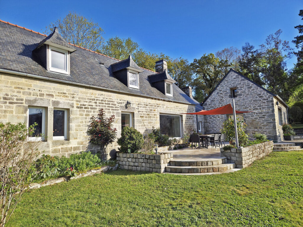 La bâtisse principale, une authentique longère bretonne aux prestations haut de gamme, présente une belle entrée, un vaste salon/séjour dallé en pierre, agrémenté d’une cheminée, un bureau-bibliothèque avec poêle à bois et une cuisine équipée/aménagée avec plafond en bois en forme de coque de bateau inversée. Une salle d’eau, une lingerie avec cellier et une cave, complètent l’ensemble. Exposée sud-est, vous apprécierez la belle luminosité et cette précieuse sensation d’espace, ainsi que les terrasses avec leur voile d’ombrage et son jacuzzi.