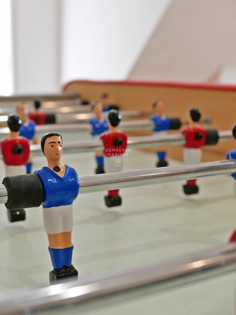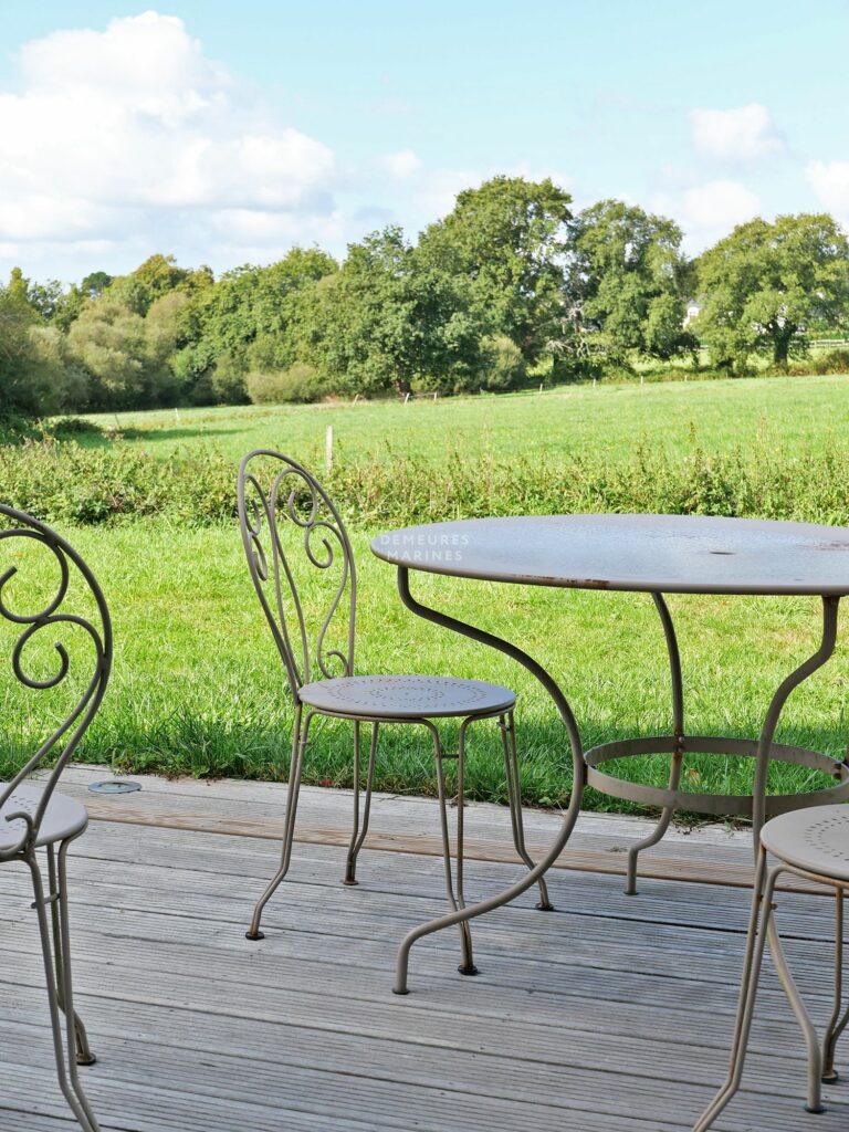 L’entrée s’ouvre sur un grand dressing et mène à un vaste salon-séjour baigné de lumière, avec un accès direct à la terrasse principale, aménagée avec un salon de jardin et offrant une vue partielle sur le Golfe. La cuisine ouverte, entièrement équipée, donne quant à elle sur une terrasse latérale avec vue dégagée sur les champs, garantissant calme et sérénité.