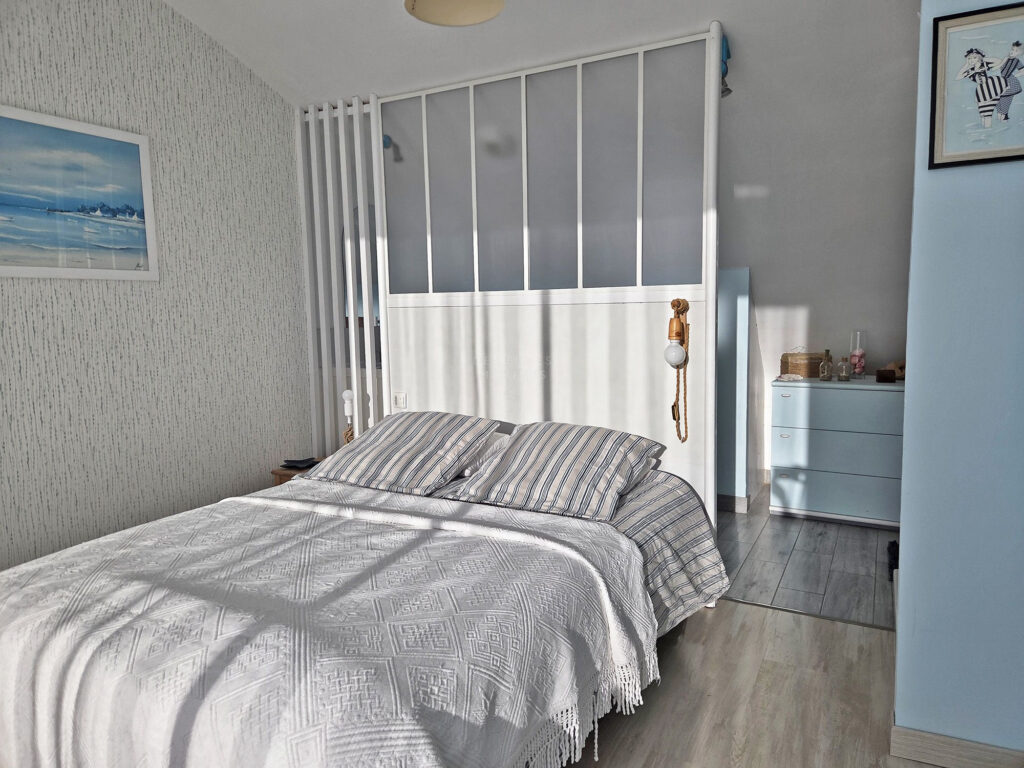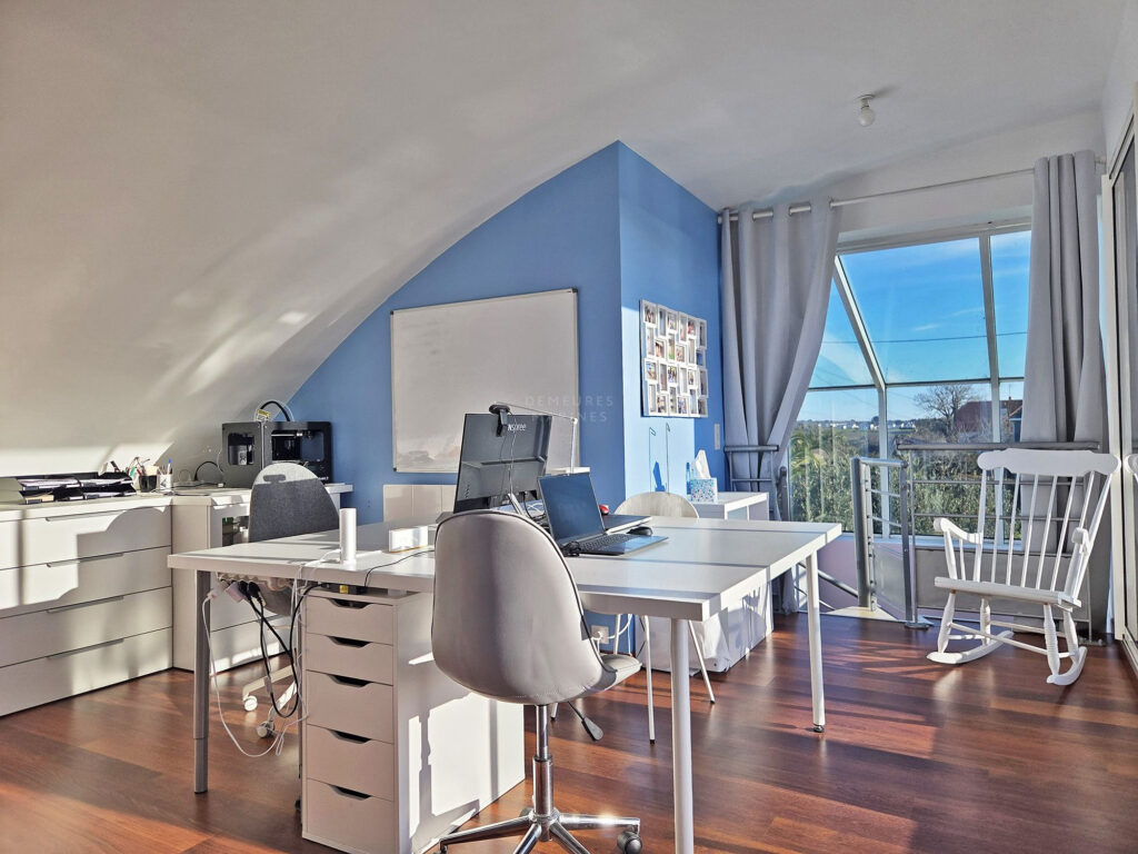 À l’étage, un bureau ouvert et inondé de clarté invite au travail mais aussi à la contemplation. Il se prolonge avec un vaste balcon exposé sud et offre une belle vue mer sur l’île de Groix et sur la Ria. Une chambre supplémentaire avec sa salle d’eau complète ce niveau.