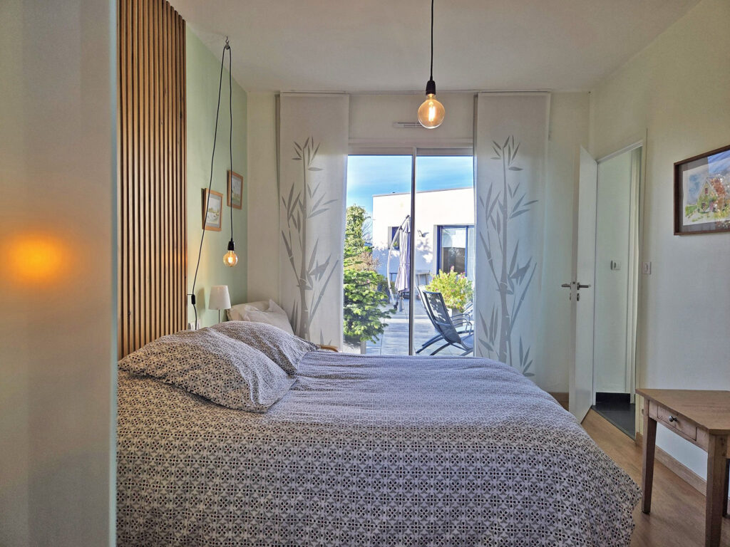 Les espaces nuit, parfaitement distincts, garantissent confort et intimité. À une extrémité de la maison, deux chambres disposent chacune de leur salle d’eau privative, un agencement idéal pour recevoir famille et amis. À l’opposé, la suite parentale offre un véritable cocon avec une chambre spacieuse de 27 m2, de larges ouvertures sur le jardin, un dressing et une salle d’eau dédiée.
