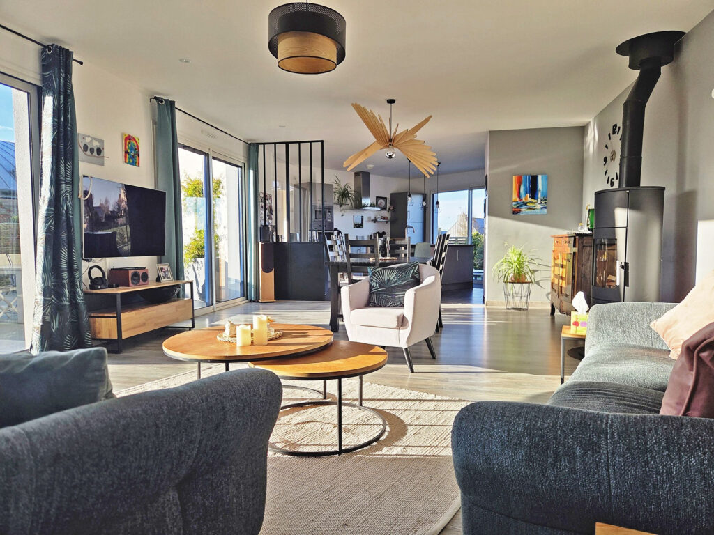 Le rez-de-chaussée accueille une pièce de vie généreuse de 48 m2, entièrement ouverte et baignée de lumière. Le salon, réchauffé par un poêle à bois, dialogue harmonieusement avec l’espace salle à manger et la cuisine aménagée et équipée. Cette dernière, dotée d’un îlot central, s’ouvre directement sur l’une des terrasses exposées ouest, idéale pour les repas ensoleillés. Une arrière-cuisine complète cet ensemble fonctionnel et élégant.