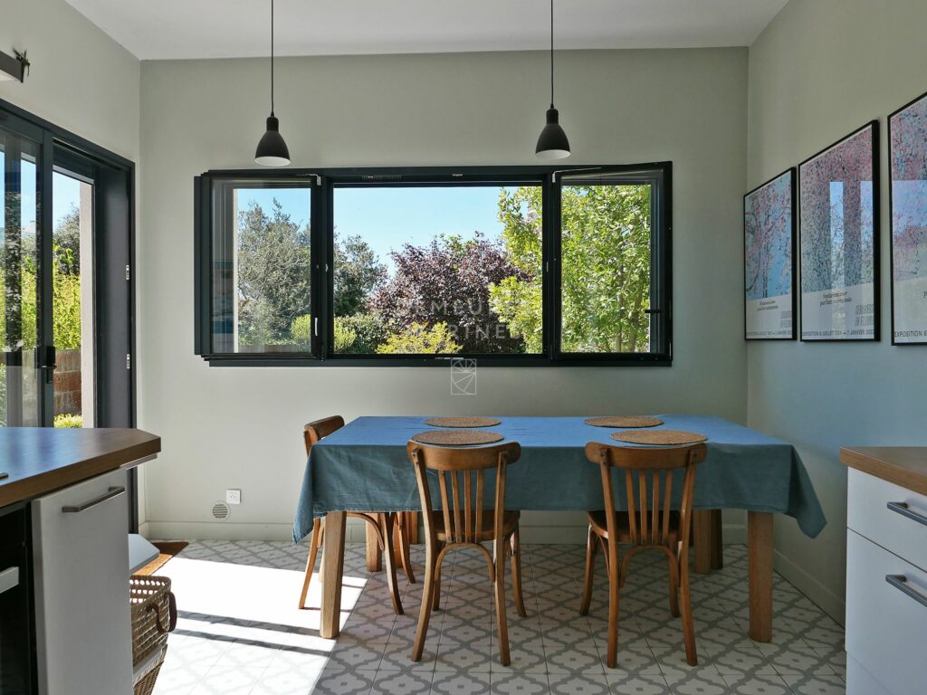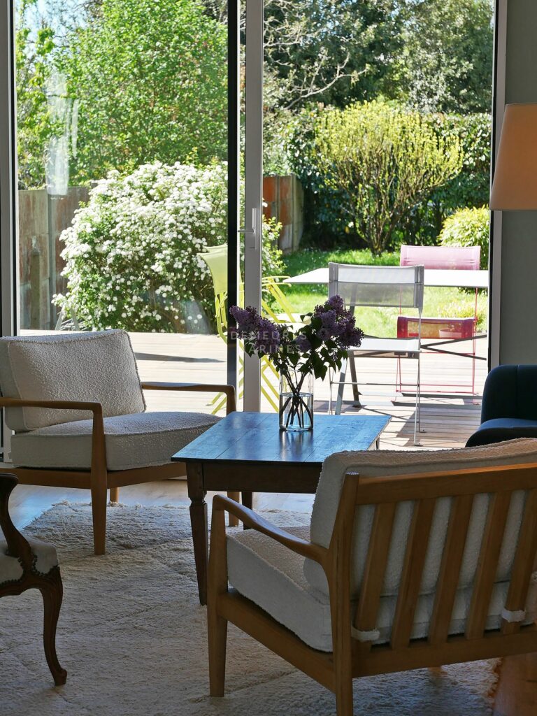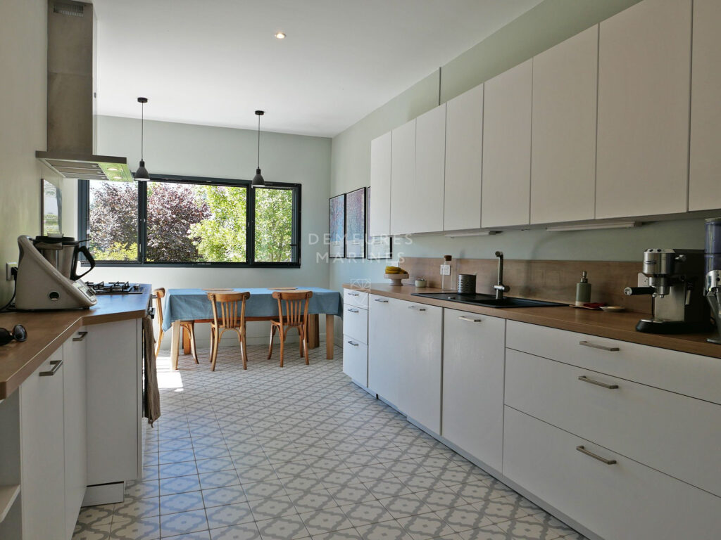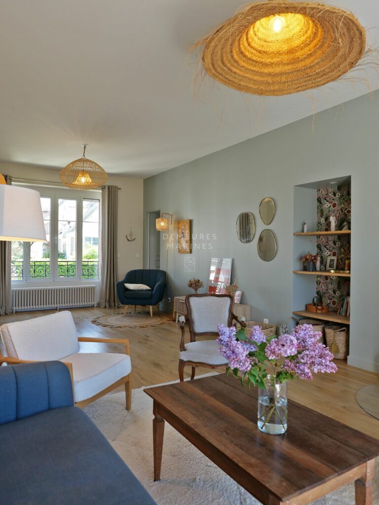 Édifiée sur un jardin paysager de 673 m2, elle révèle une harmonie délicate entre le charme de l’ancien et une écriture actuelle. Teintes douces, parquets anciens et lignes épurées dessinent un univers raffiné.