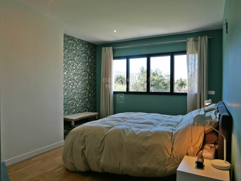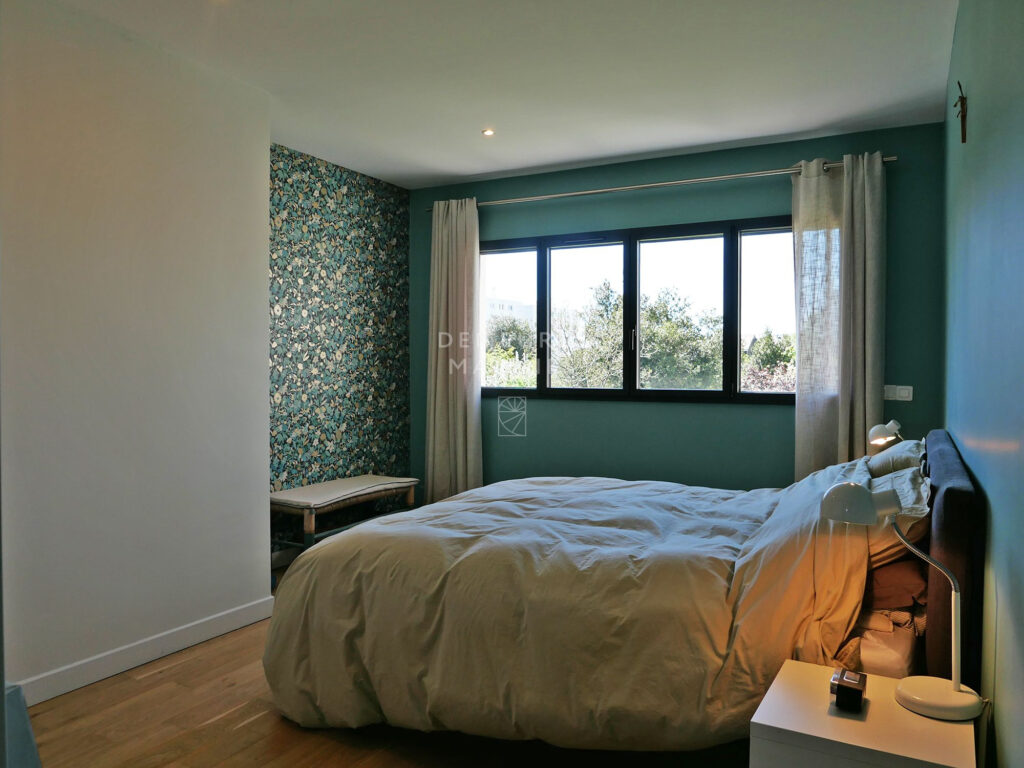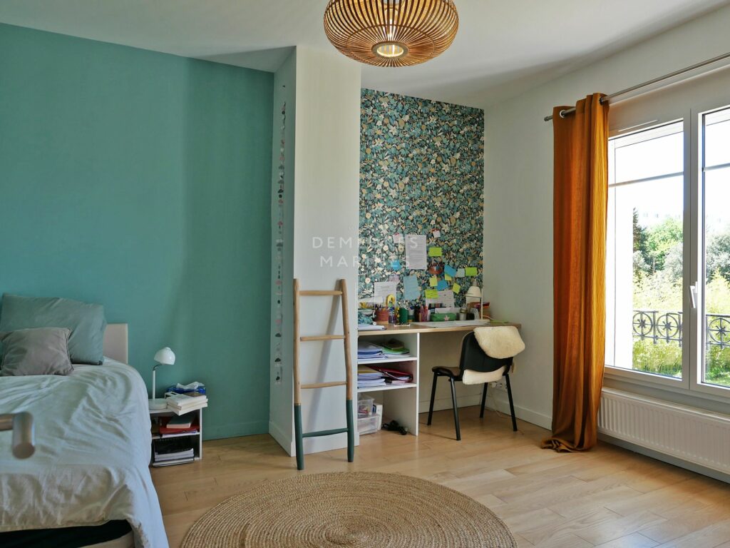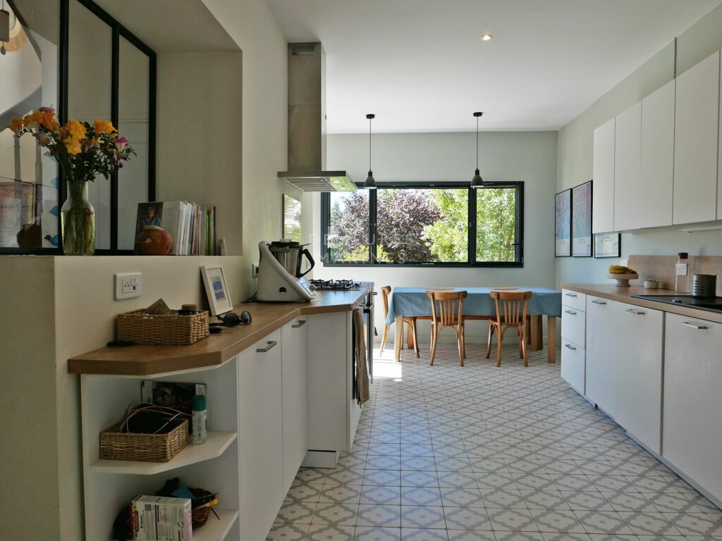 Édifiée sur un jardin paysager de 673 m2, elle révèle une harmonie délicate entre le charme de l’ancien et une écriture actuelle. Teintes douces, parquets anciens et lignes épurées dessinent un univers raffiné.