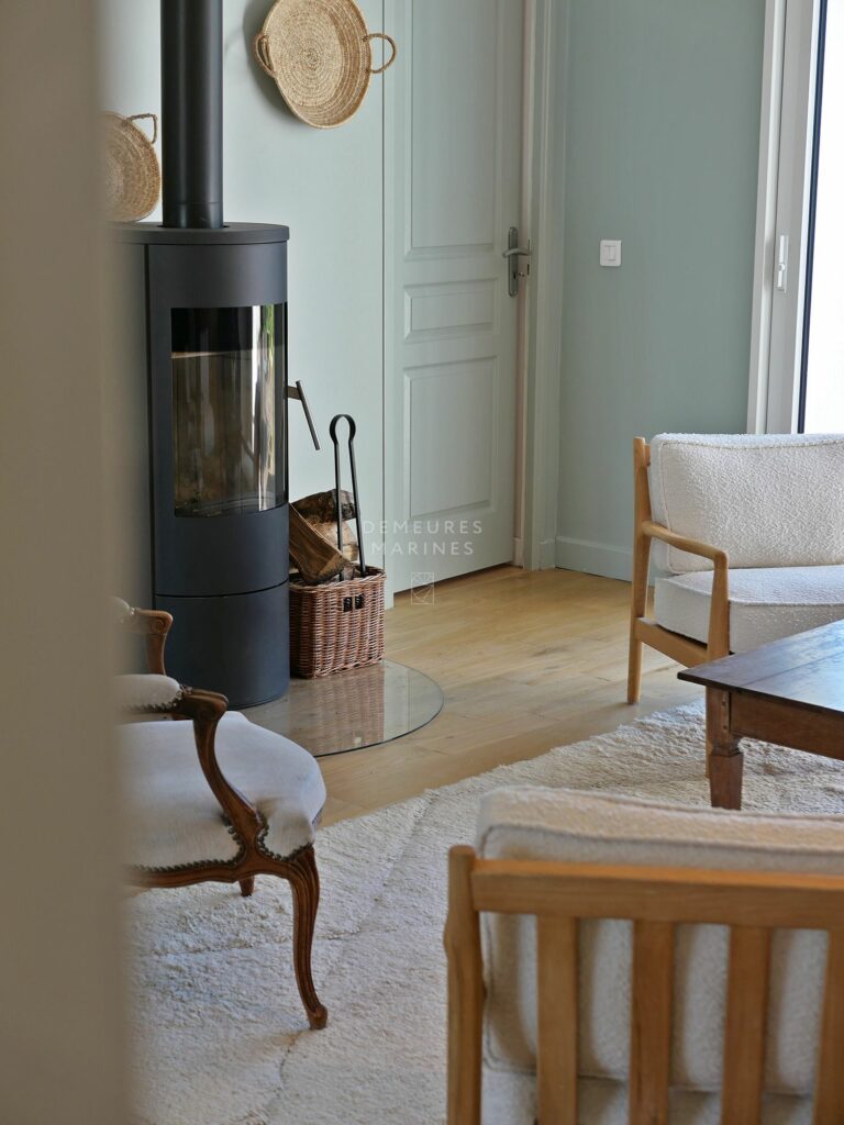 Le rez-de-chaussée accueille une cuisine équipée et aménagée avec espace repas, ouverte sur la terrasse pour prolonger les instants partagés aux beaux jours. Le salon, traversant, s’anime autour d’un poêle à bois et se pare de lumières changeantes au fil des heures, promesse de soirées d’hiver chaleureuses. Les ouvertures laissent entrer le jardin comme une respiration, effaçant doucement la frontière entre intérieur et extérieur.