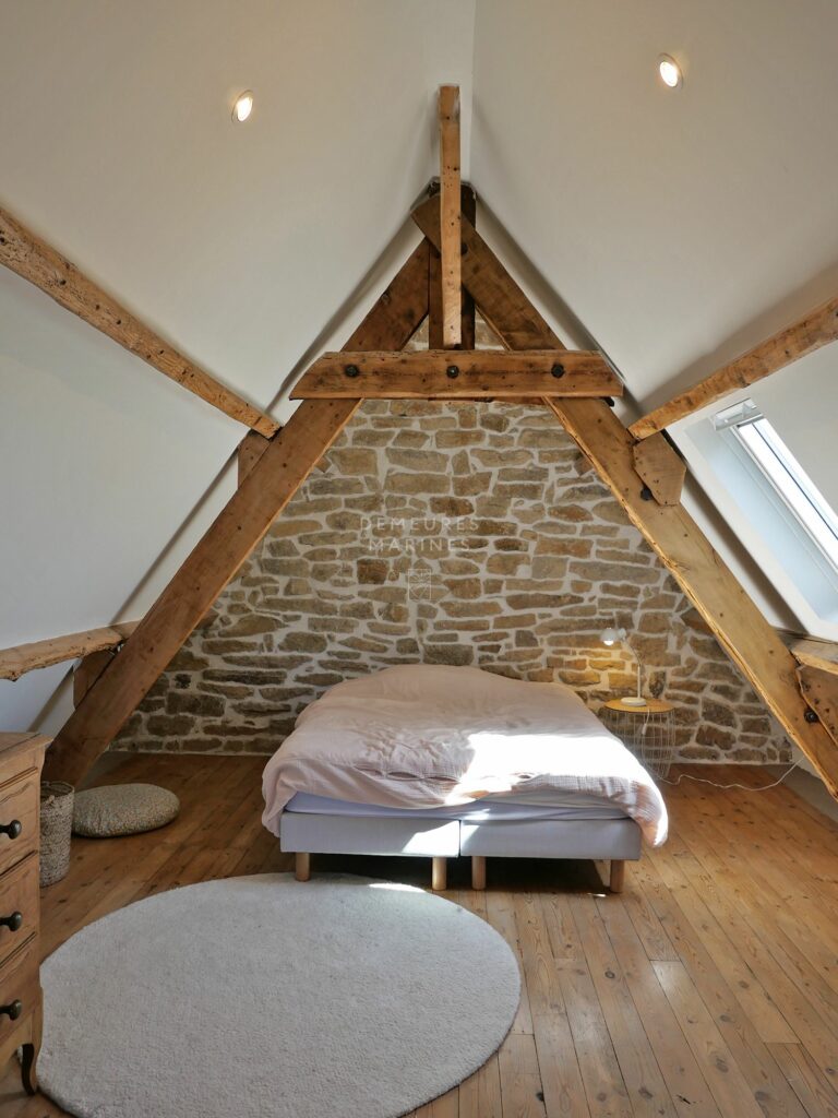 Au second et dernier niveau, une suite empreinte de charme, avec salle d’eau privative (douche), dévoile une ambiance singulière. Poutres apparentes, pierre et lumière douce s’y rencontrent pour créer un lieu à part, hors du temps.