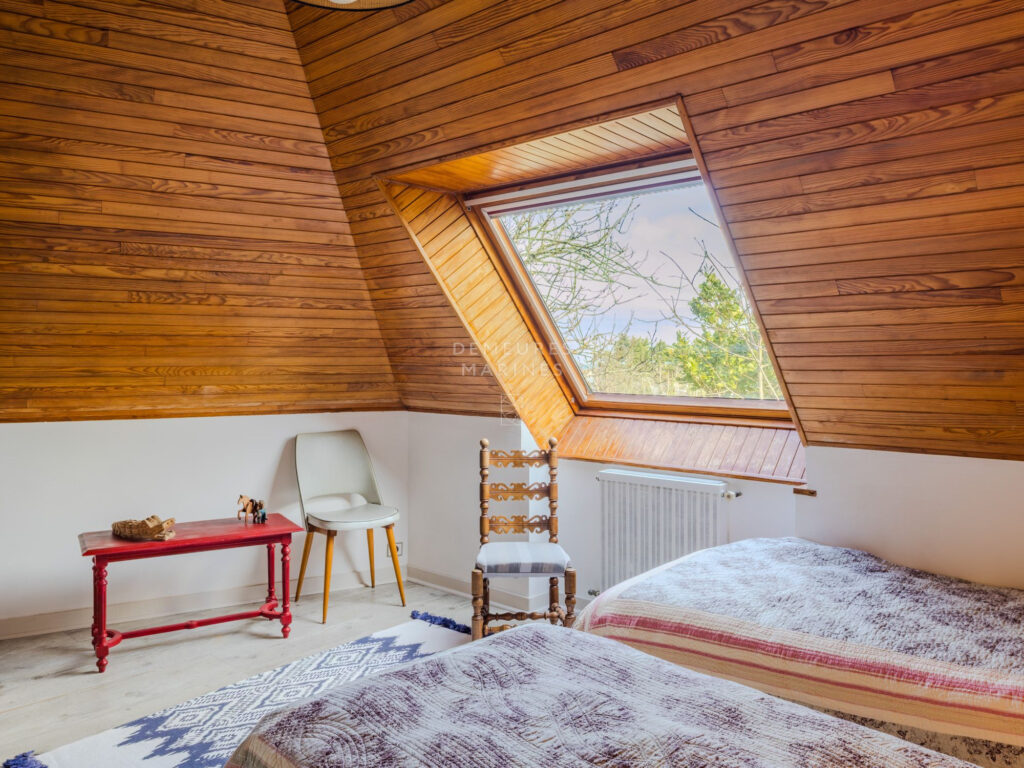 Le rez-de-chaussée s’ouvre sur une pièce de vie lumineuse de 80 m2, avec un séjour, une cuisine ouverte et un salon déplafonné organisé autour d’une cheminée. Cet espace laisse apparaître depuis ses larges baies un nuancier de vert.
