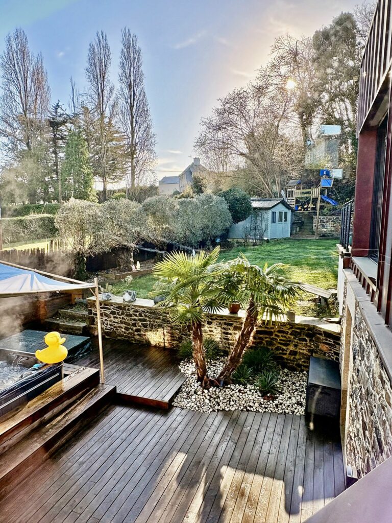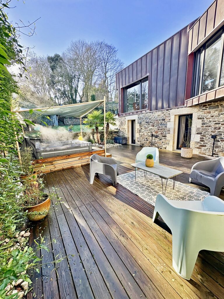 Le jardin, idéalement exposé plein sud, est une véritable invitation à la détente. Il est aménagé en plusieurs espaces : une grande terrasse accueillant un spa, un jardin paysager, un garage, une cave discrète sous la terrasse, ainsi qu’un cabanon en pierre. Le bardage contemporain de la maison souligne son architecture moderne, s’intégrant avec élégance à son environnement.