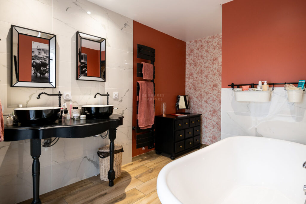 Au rez-de-chaussée, l’espace nuit est intelligemment agencé en deux suites distinctes. La première se compose d’une chambre, d’une salle d’eau et d’un dressing pouvant faire office de bureau. La seconde, véritable suite parentale, offre une chambre confortable, deux dressings et une salle de bains (baignoire et douche). Celle-ci bénéficie d’un accès direct à la terrasse, créant une connexion privilégiée avec l’extérieur et le spa.