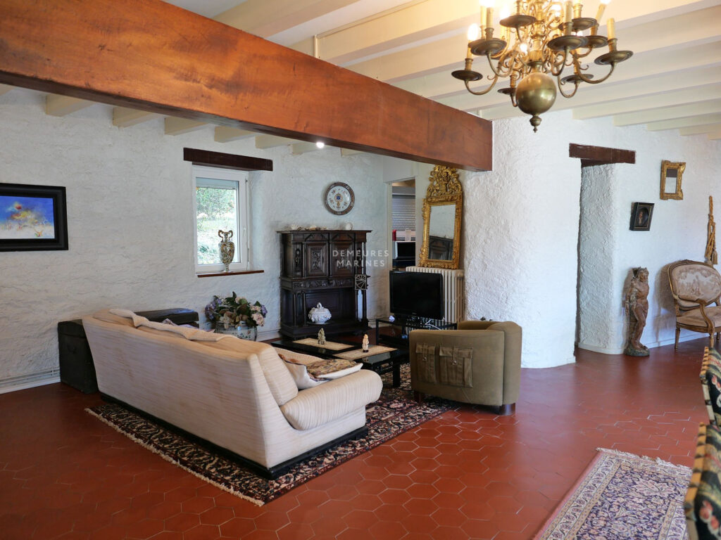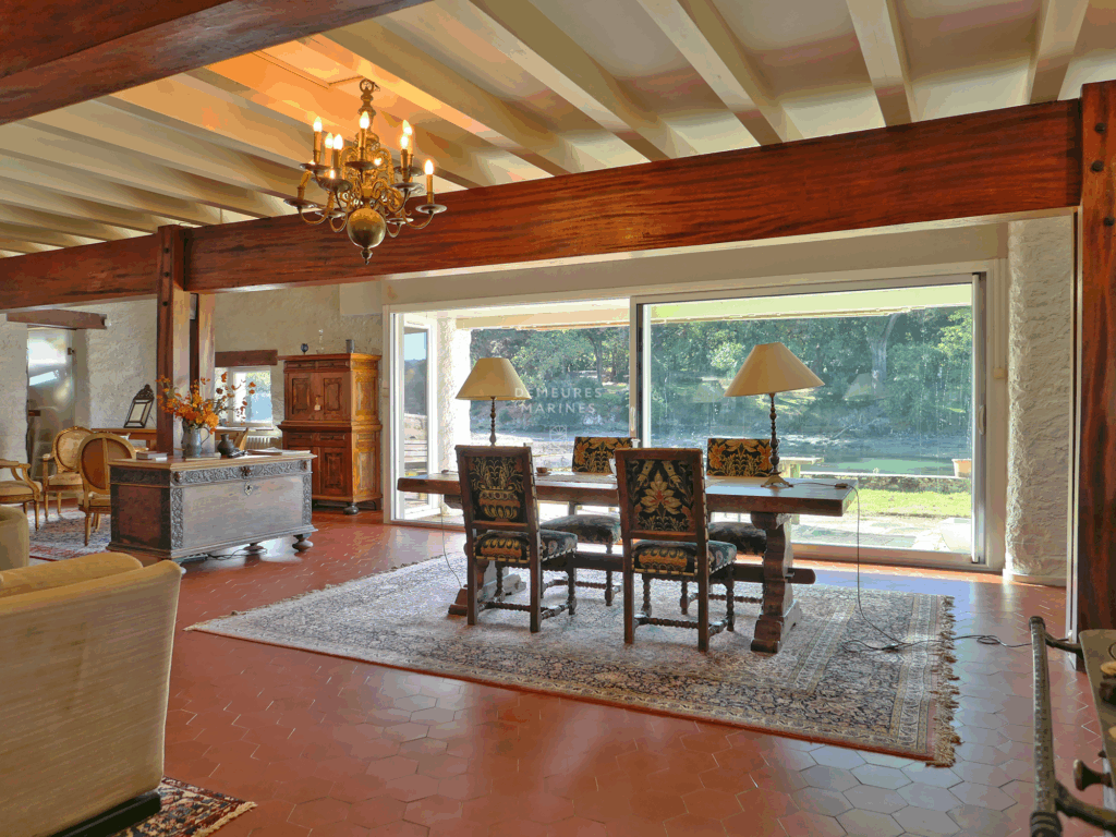 L’espace de vie de 93 M2 présente une entrée, un salon et une salle à manger agrémentée d’une cheminée. Un très beau volume, tout en rondeur, qui s’ouvre par de grandes baies vitrées sur la terrasse en pierre. Vous profiterez d’une vue magique sur le moulin à marée, l’étang et cette petite baie où les marins abritent leurs bateaux. Un point de départ magique pour des randonnées sur terre et sur mer selon votre inspiration. Une cuisine indépendante équipée/aménagée complète l’ensemble.