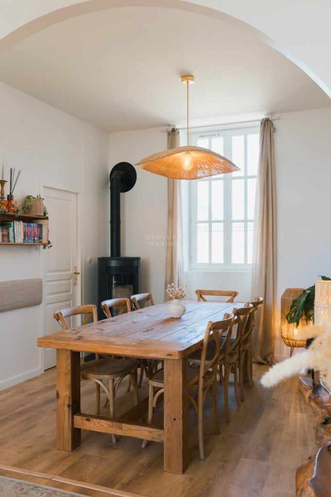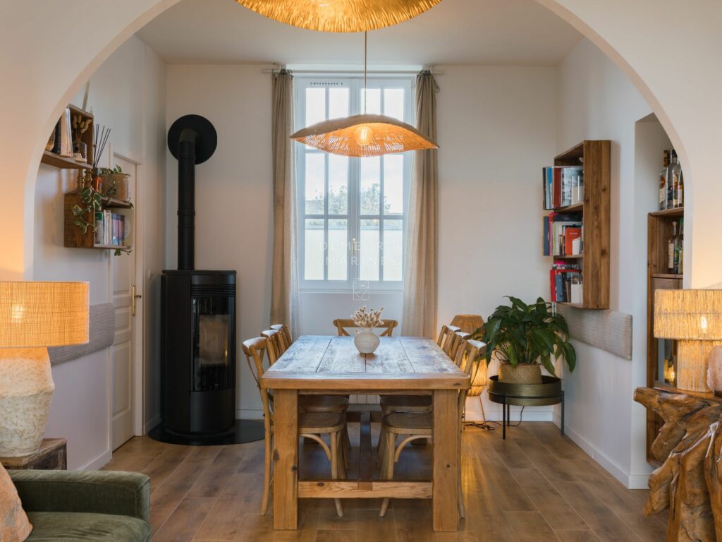 Une fois passé le portail en fer forgé, on y accède par un large perron sculpté. Une vaste entrée ouvre sur le salon-séjour traversant, animé par son poêle à pellets. Plus intime, la cuisine équipée sera le terrain d’expression de vos futurs usages. Une première suite avec salle de bains (baignoire et douche) et espace dressing vient parfaire ce premier tableau. Une seconde entrée dessert l’arrière de la maison.