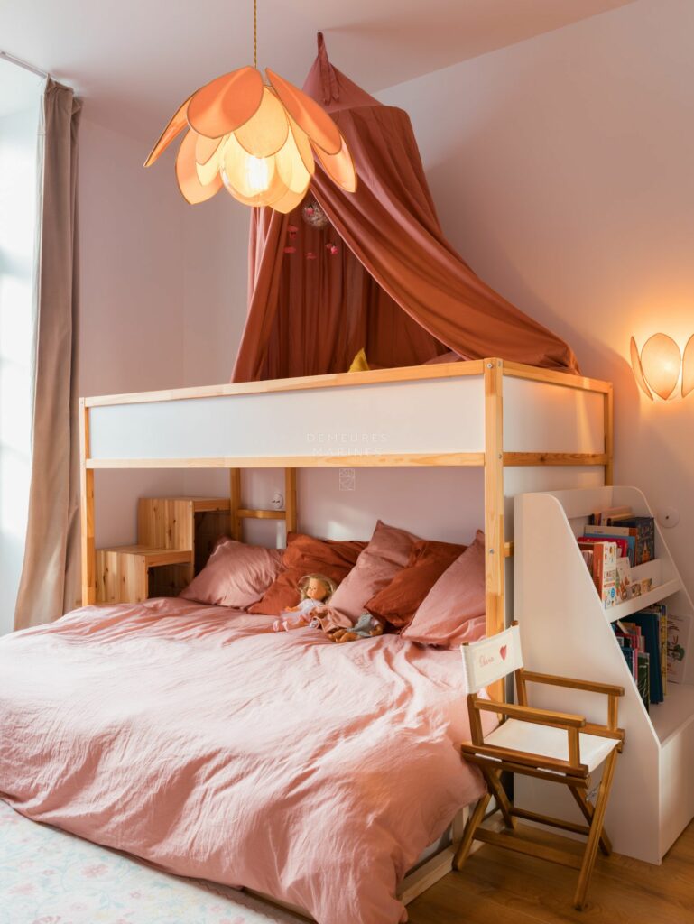 Au premier étage, deux chambres avec salle d’eau privative (douche), chacune portée par les belles hauteurs sous plafond. L’une a gardé sa cheminée d’époque. En complément, un salon lecture attend vos moments de détente.