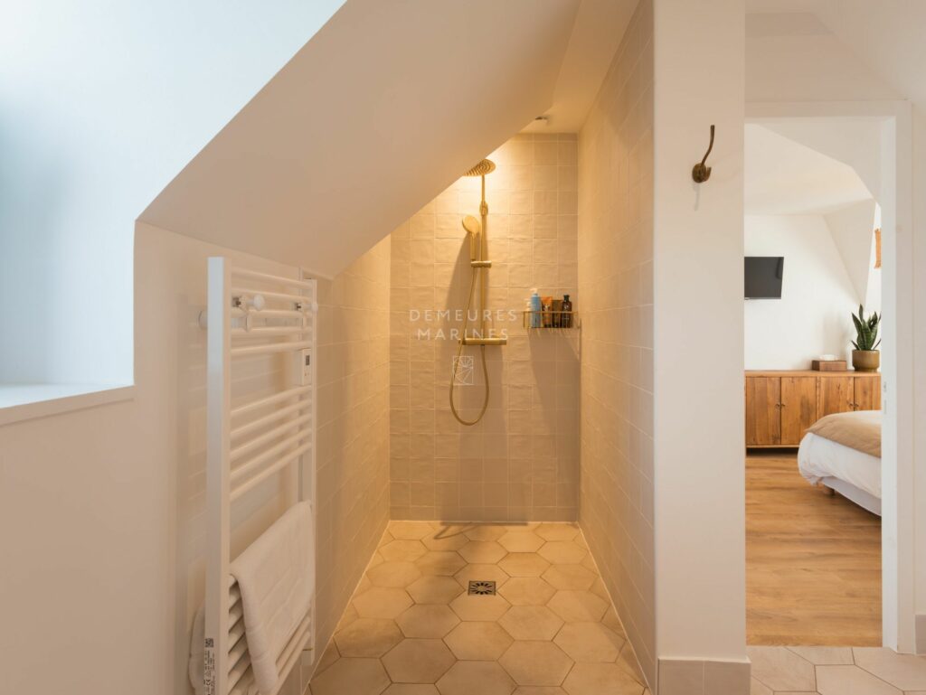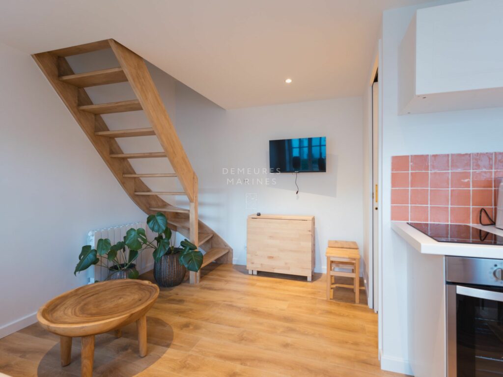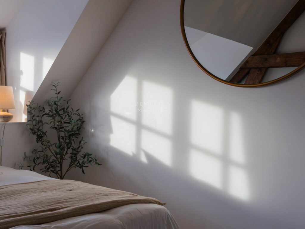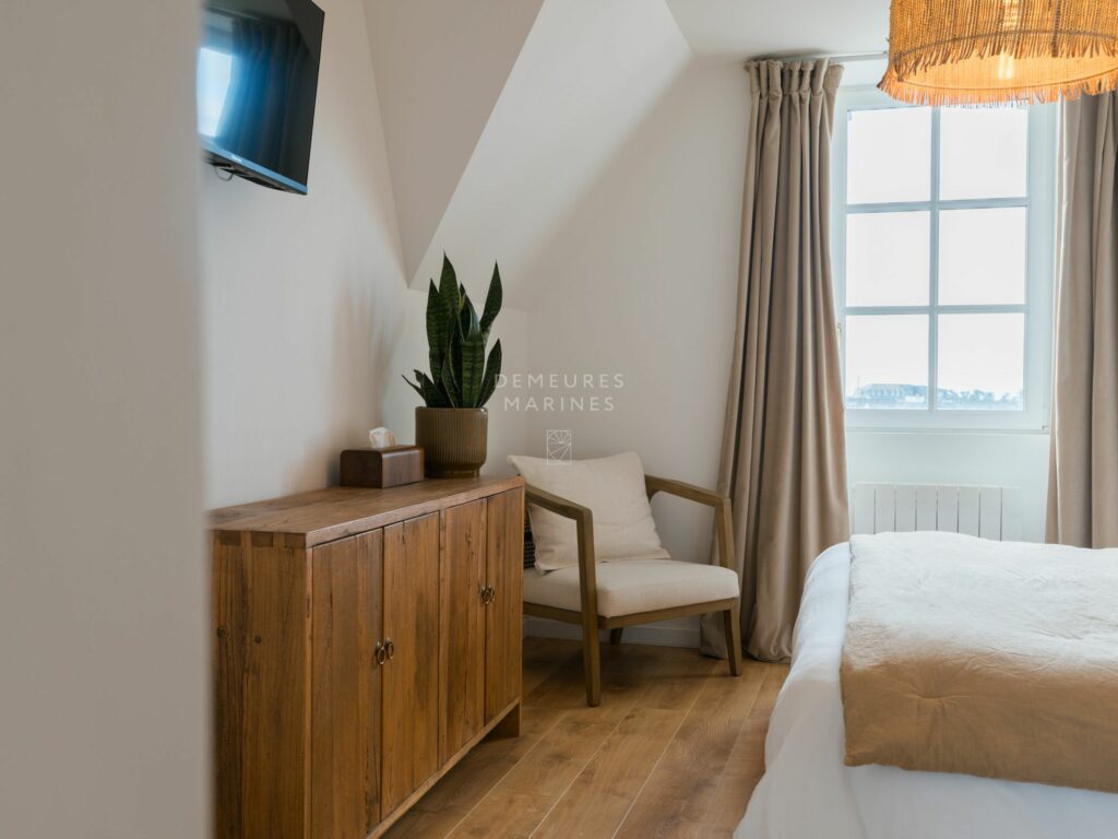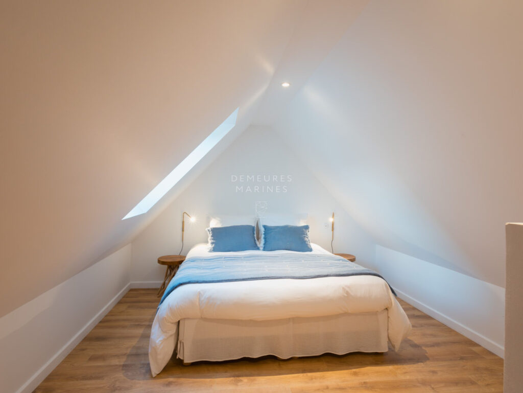 Le deuxième étage dessert deux nouvelles suites. L’une est dotée d’une salle de bains (baignoire et douche). L’autre a sa terrasse privative suspendue offrant la vue sur mer. D’ici, on respire l’âme de Roscoff.