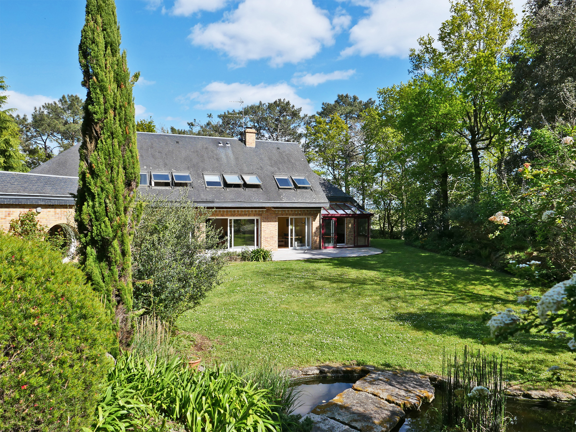 Un bel espace nuit de plain-pied complète l’ensemble avec une chambre disposant d’une cheminée insert et une suite parentale offrant une véranda esprit jardin d’hiver, un dressing et une salle de bains (baignoire, douche multi-jets et WC).
