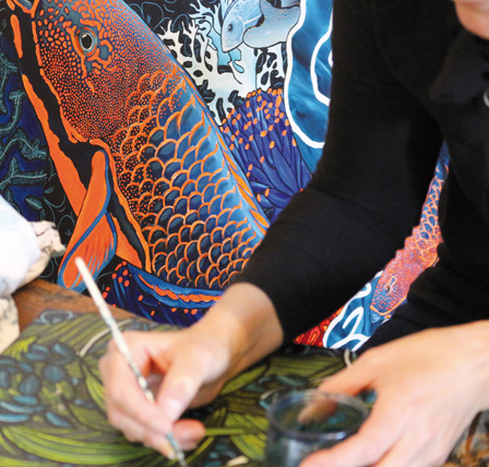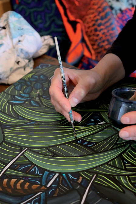 La Polynésie est en moi depuis toujours. Je la peignais bien avant de m’y rendre physiquement. J’y suis allée et j’ai ramené de ce voyage des motifs dont la fleur polynésienne que l’on retrouve aujourd’hui dans chacune de mes peintures. C’est mon fil conducteur. Je considère chaque motif comme un discours, j’écris à travers eux une histoire qui signifie quelque chose. Cette fleur polynésienne me permet de donner de la profondeur à mes tableaux. Cette profondeur fait écho à mon attachement à ce pays où l’on vit en connexion avec la terre mère, le céleste, la mer. Ça me tient vraiment à cœur et c’est ma signature.