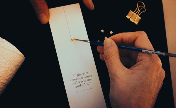 Il faut imaginer que tout ce que je présente est fabriqué par mes soins, « à la main », dans mon atelier à Vannes. C’est beaucoup de temps, d’attention, de précision. Les éléments scintillants que vous pouvez retrouver sur les marque-pages où les cartes, je les pose un par un au pinceau. Au préalable, j’ai dessiné le visuel, découpé le papier… Un travail d’orfèvre qui me passionne.