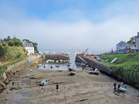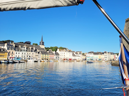 Port Tudy s’affiche devant nous (premier port de Pêche Thonier de France au début du XXème  avec ses 300 bateaux, Rien que cela… !!!). Les mâts derrière les quais suggèrent la présence de nombreux voiliers, les places à couple ou sur pontons sont déjà prises. Sauf une…. la nôtre qui nous attend.