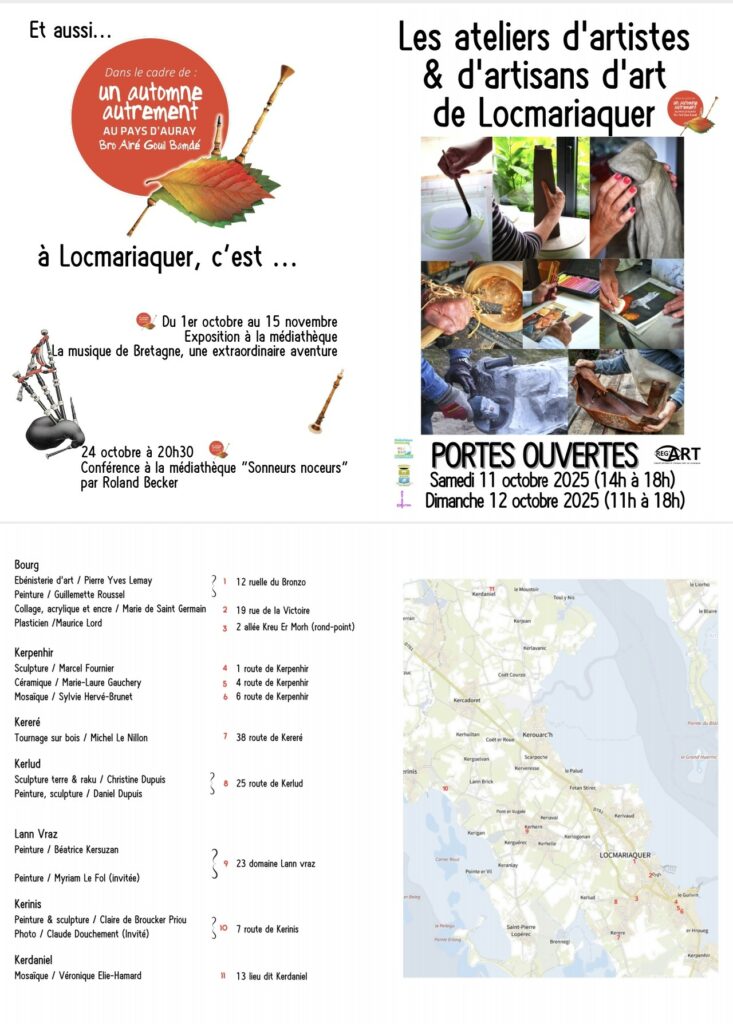👉 Un Automne Autrement – Les Ateliers d’artistes de Locmariaquer du 11 au 12 octobre dans différents endroits de la ville.