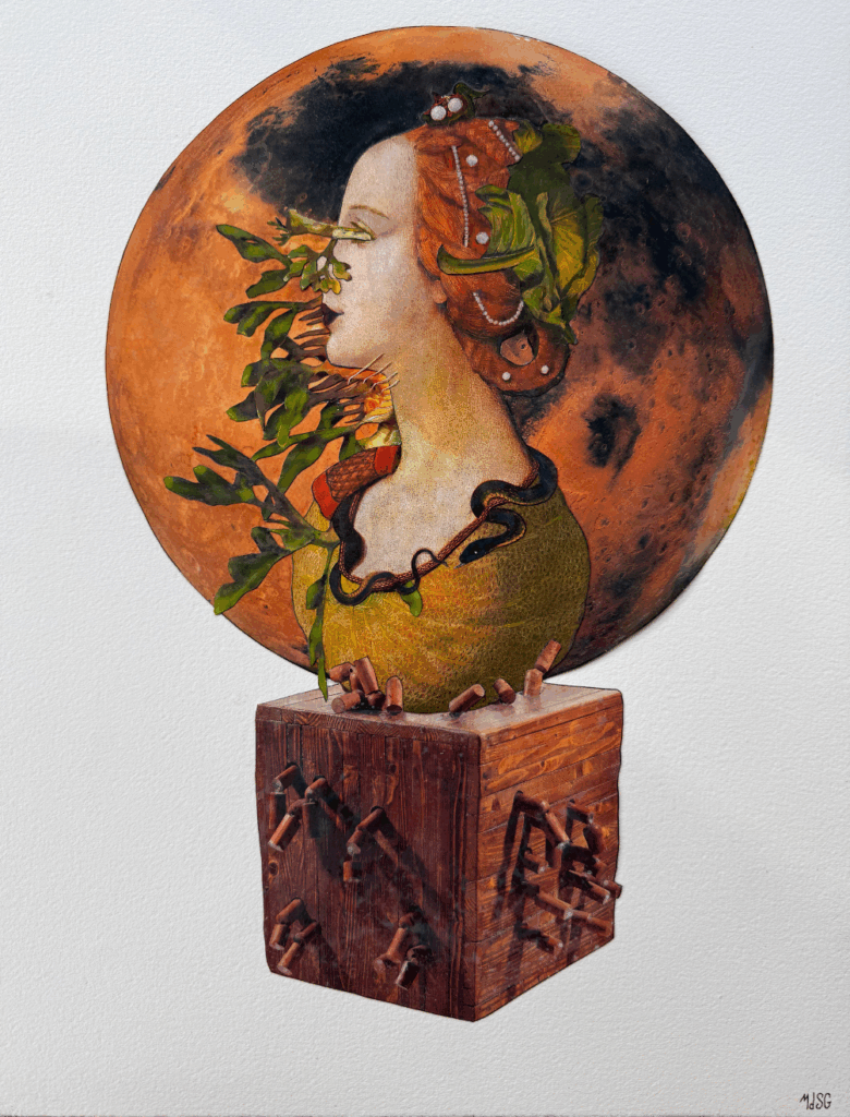 Je suis une artiste autodidacte. Mon aventure artistique a commencé pendant la période du Covid, un moment suspendu où je me suis retrouvée seule, comme beaucoup. J’ai alors commencé à expérimenter le collage, exclusivement papier au début, puis j’ai intégré d’autres matières : carton, ficelle, peinture acrylique, encre de Chine… Aujourd’hui, je travaille en mix media, une technique qui me permet d’assembler tous ces éléments pour créer une composition unique. Chaque tableau est minutieusement colorisé à l’acrylique et à l’encre pour atteindre les teintes qui résonnent avec l’esprit de l’œuvre.