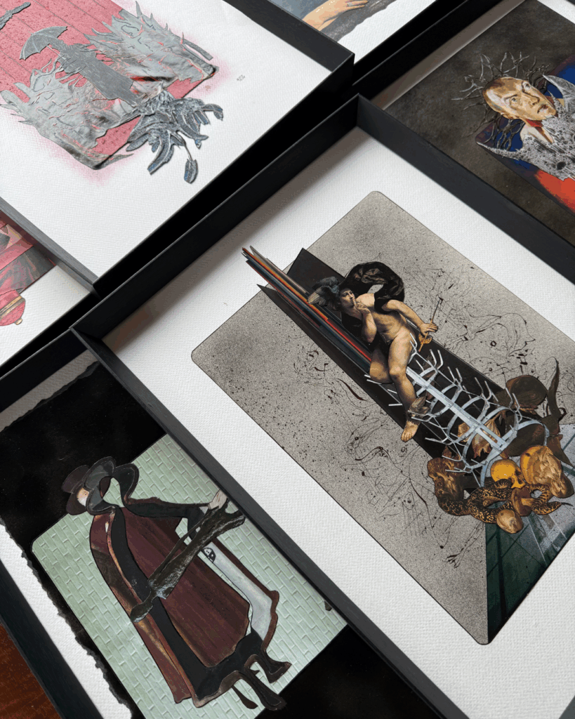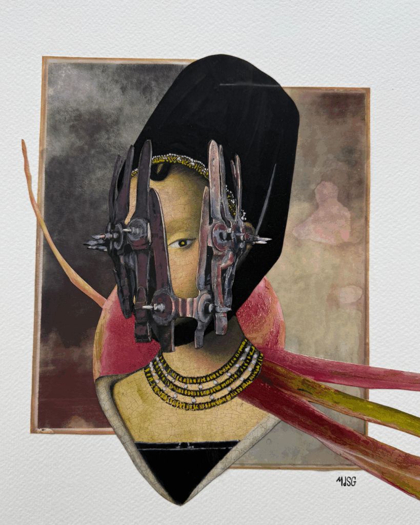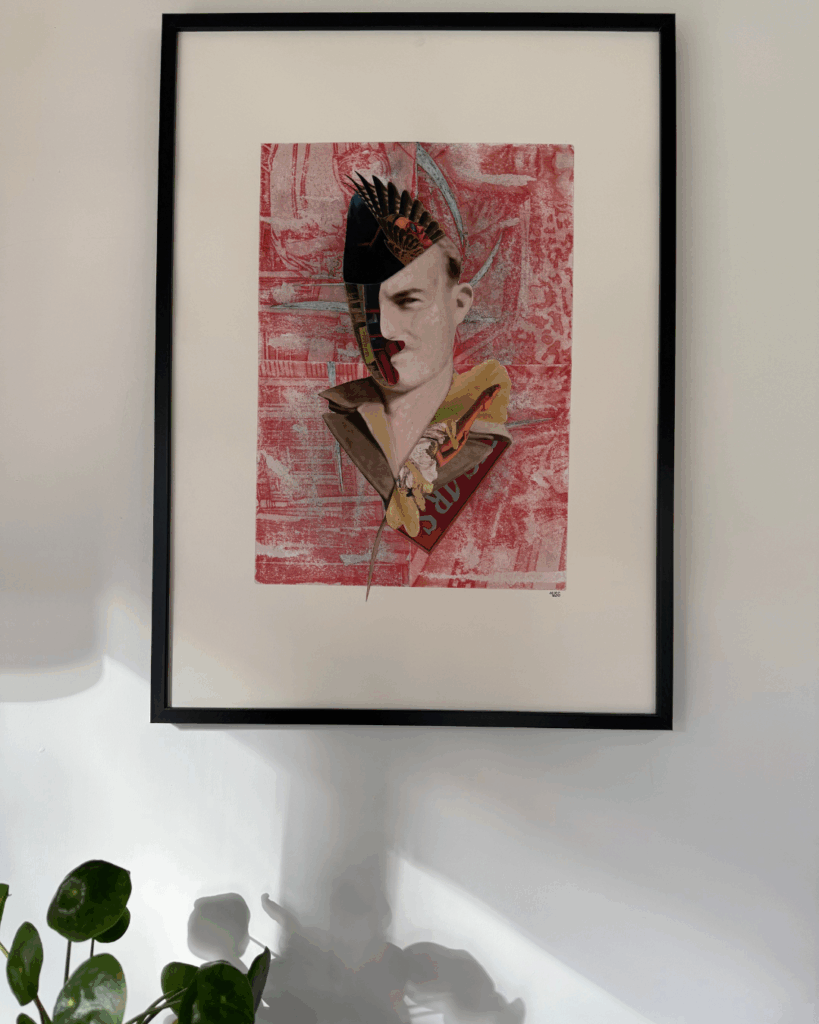 Je suis une artiste autodidacte. Mon aventure artistique a commencé pendant la période du Covid, un moment suspendu où je me suis retrouvée seule, comme beaucoup. J’ai alors commencé à expérimenter le collage, exclusivement papier au début, puis j’ai intégré d’autres matières : carton, ficelle, peinture acrylique, encre de Chine… Aujourd’hui, je travaille en mix media, une technique qui me permet d’assembler tous ces éléments pour créer une composition unique. Chaque tableau est minutieusement colorisé à l’acrylique et à l’encre pour atteindre les teintes qui résonnent avec l’esprit de l’œuvre.