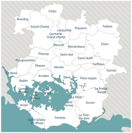 Nous retrouvons les communes du Bono, de Baden, de Larmor-Baden et du Hézo. Proche de Vannes et bordées par le Golfe du Morbihan, elles sont très recherchées. Elles offrent un cadre de vie de grande qualité avec cet unique petit air de campagne à la mer.