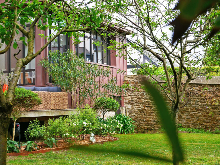 Saint-Goustan dans le Morbihan est un petit port typiquement breton situé à quelques encablures d’Auray et de Vannes. Y vivre, c’est chérir son atmosphère d’antan, ses rues pavées… et ses belles demeures en pierre qui dominent la rivière. Souvent insoupçonnables, cachées au détour de petites ruelles, ces maisons de capitaine ont fière allure. « Etincelle » est l’une de ces propriétés dissimulées derrière de grands murs en pierre qui cachent un magnifique jardin avec une vue imprenable sur la rivière d’Auray et l‘église Saint-Sauveur. Datant du XIXème siècle, cette maison en pierre typique de Saint-Goustan offre de beaux volumes de vie qui allient le charme de l’ancien (cheminée en pierre, poutres, murs en pierre) avec de beaux volumes contemporains imaginés dans une extension ouverte sur le jardin.